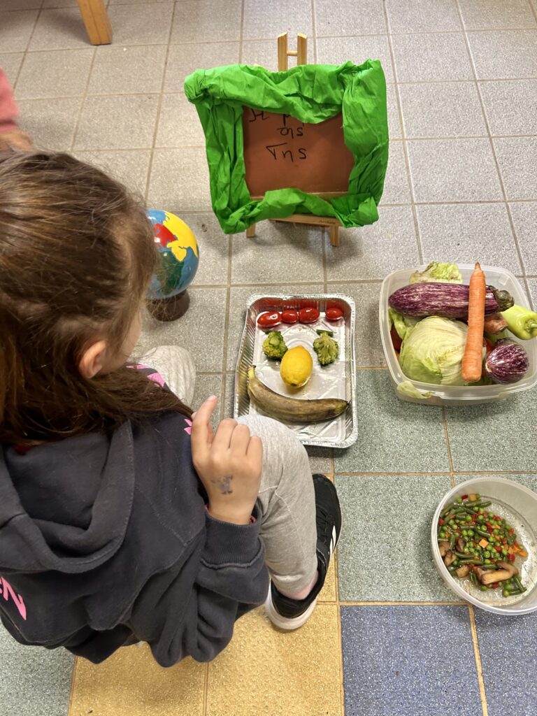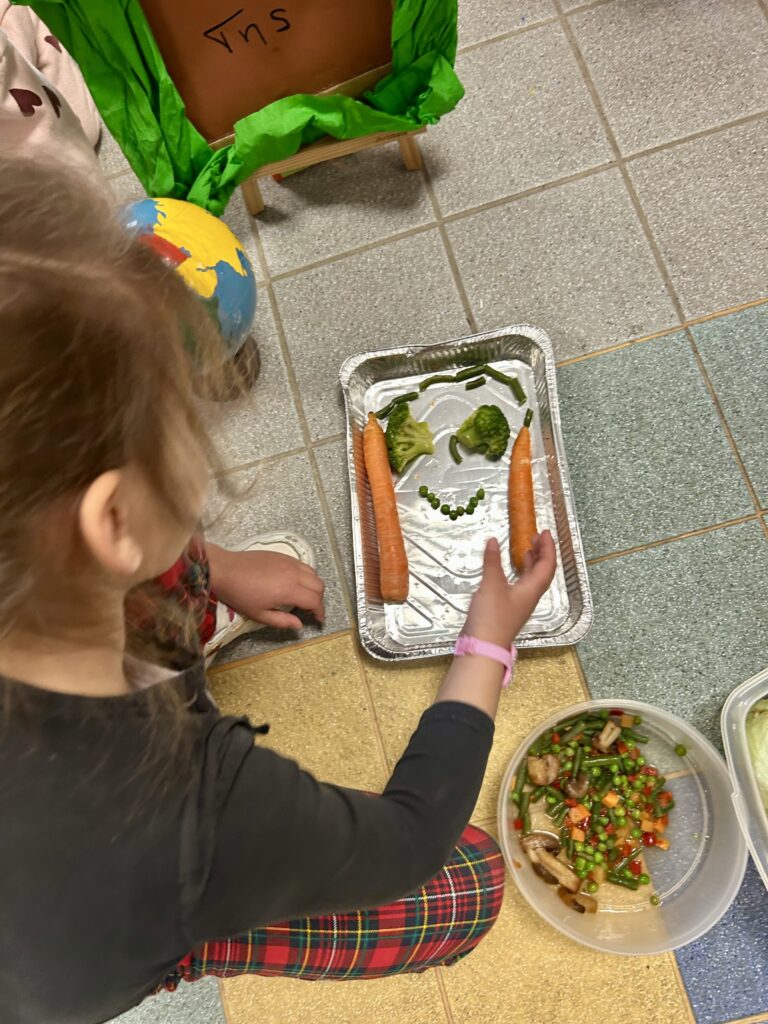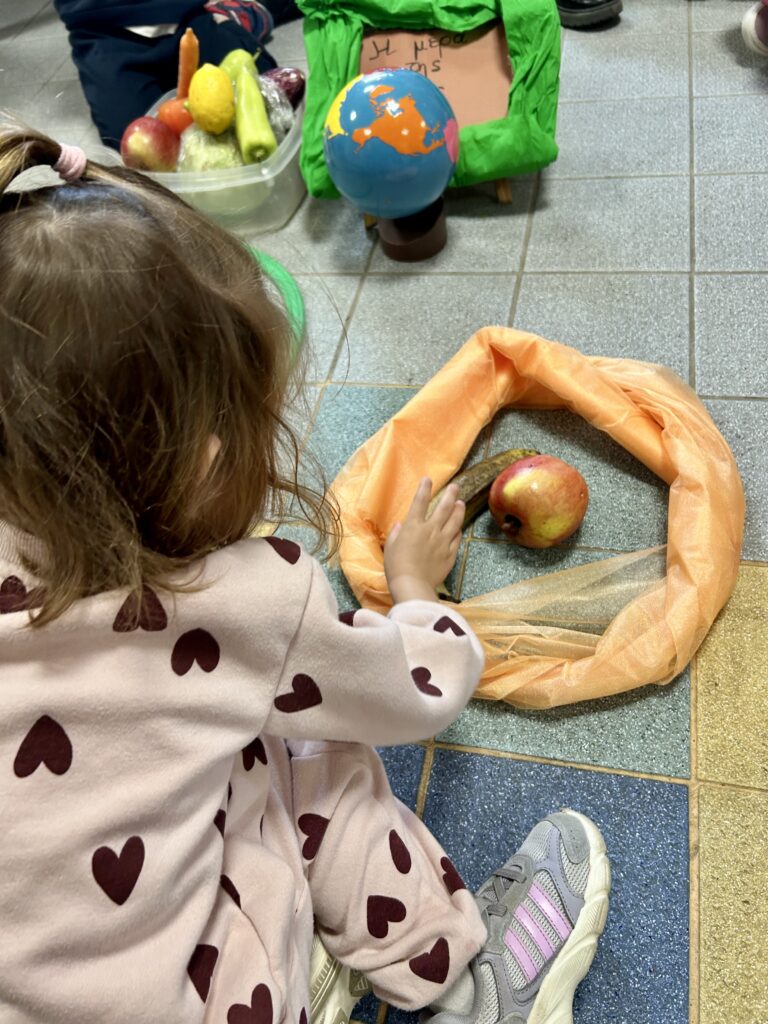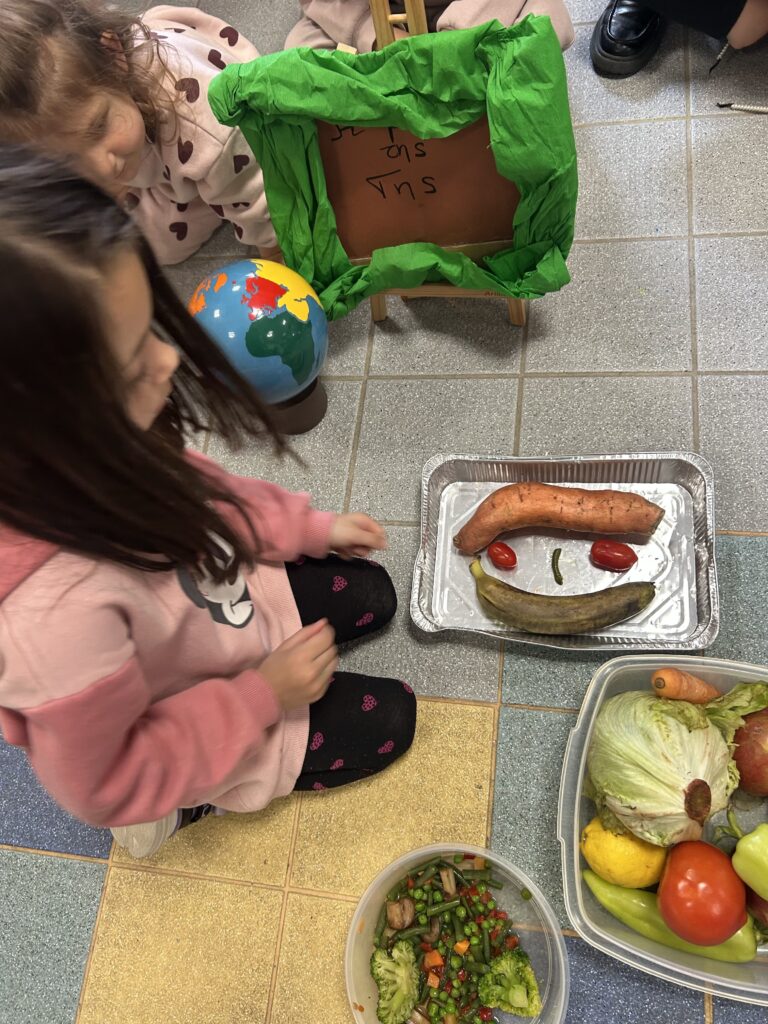 In our first activity, “Palette of Plenty,” students explored a variety of fruits and vegetables by sorting them by color and category. Through play and creativity, they created fun faces using fresh vegetables and fruits and brought them to life through imaginative storytelling.
