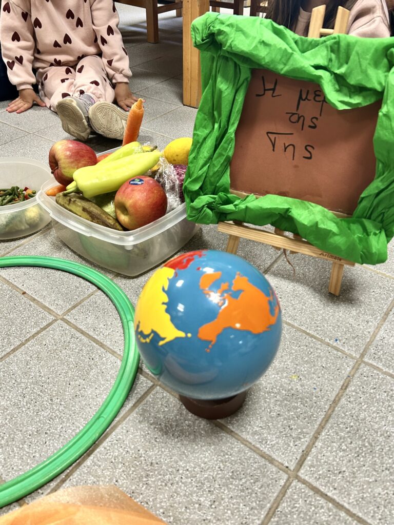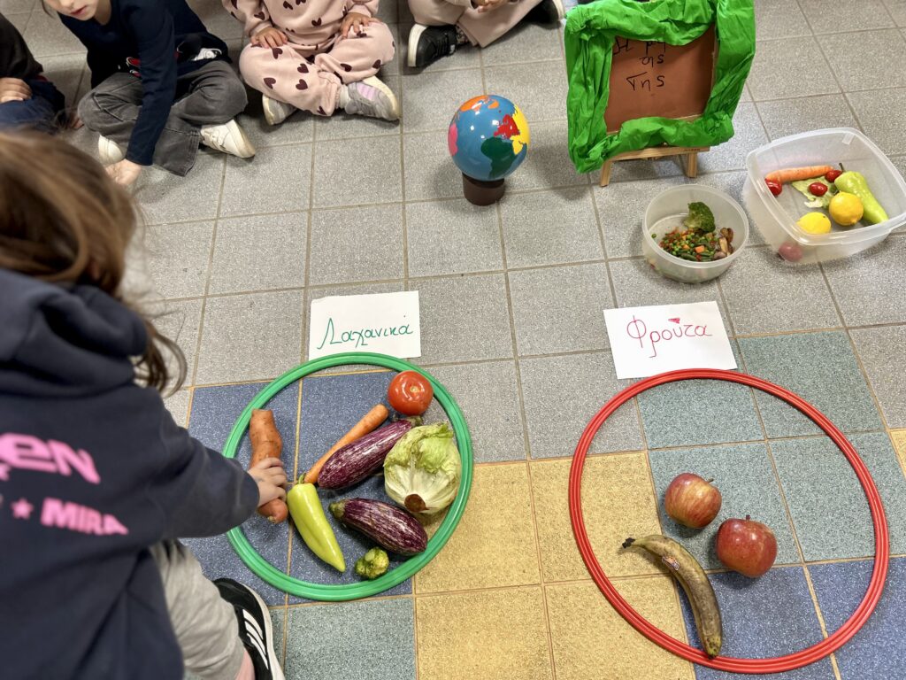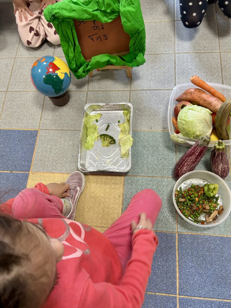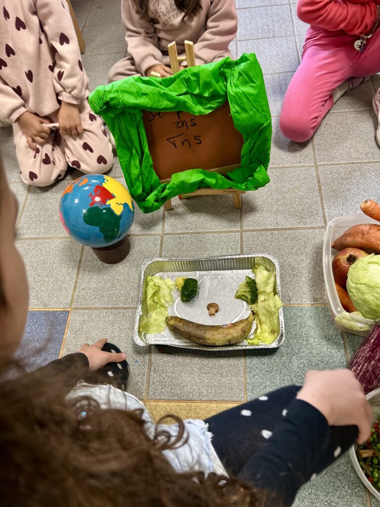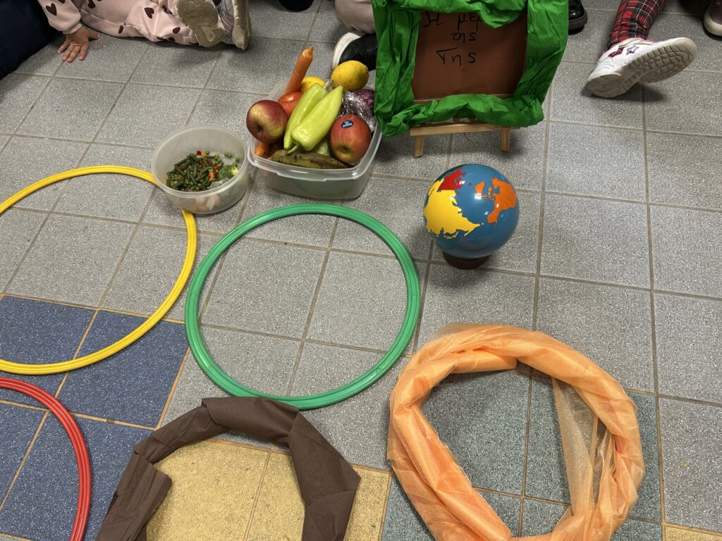 In our first activity, “Palette of Plenty,” students explored a variety of fruits and vegetables by sorting them by color and category. Through play and creativity, they created fun faces using fresh vegetables and fruits and brought them to life through imaginative storytelling.